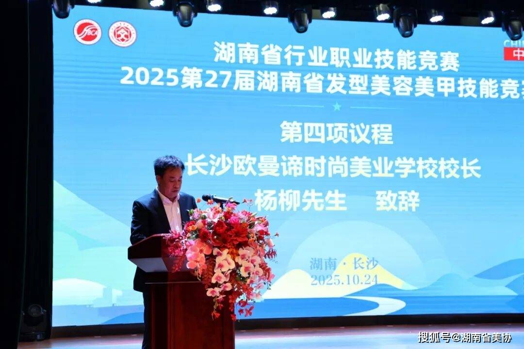 参赛单位代表长沙欧曼谛时尚美业学校校长杨柳在致辞中介绍了学校以“缔造时尚,专研美学”为理念,致力于培养具备国际视野与专业技能的美业人才。他指出,此次竞赛不仅是技艺的比拼,更是行业交流与技术融合的重要平台。欧曼谛学校希望通过赛事推动教学创新,加强与行业对接,助力美业教育与时俱进,并呼吁业界携手共建开放、包容、创新的美业生态,共促行业繁荣发展。