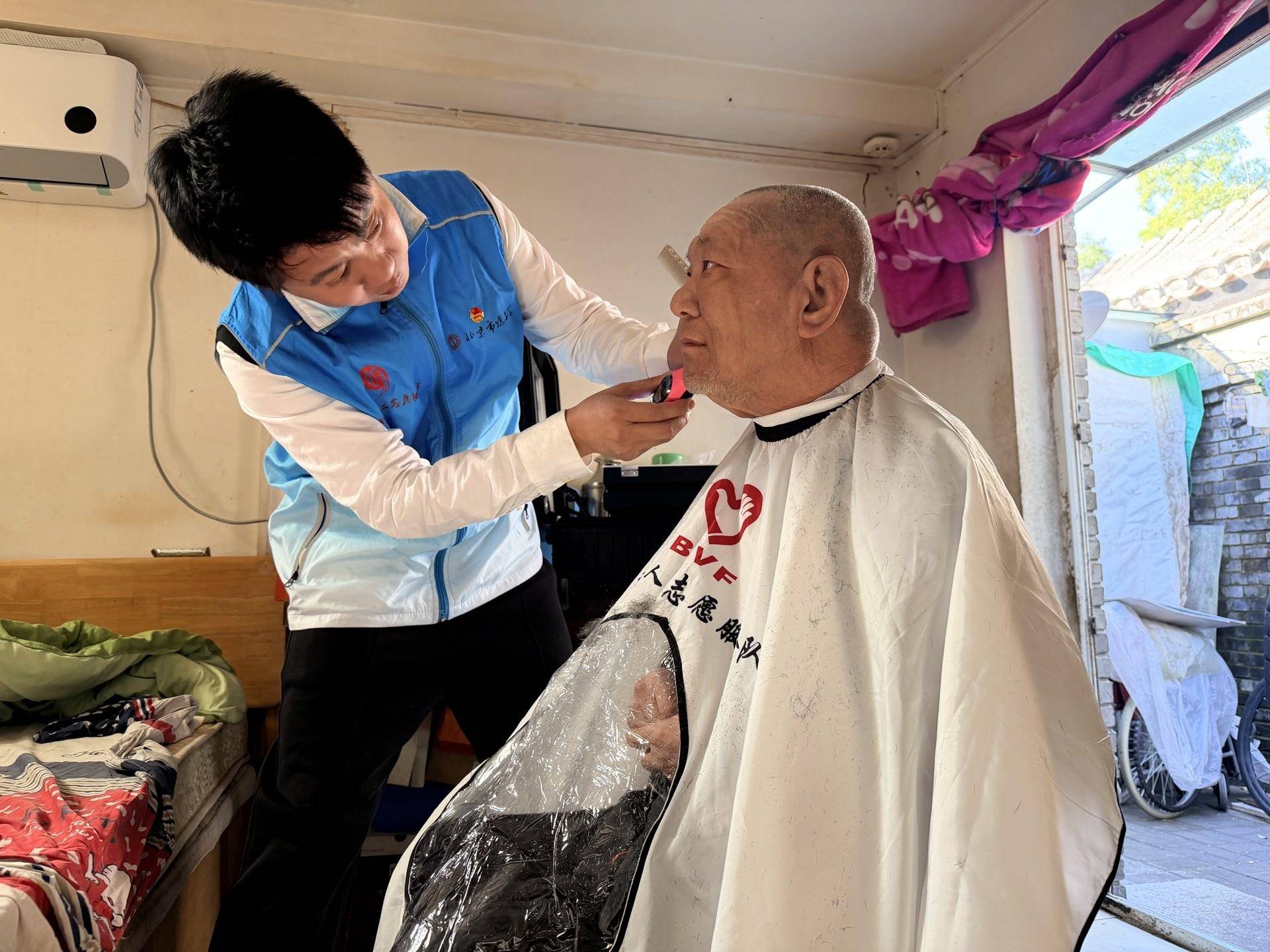 “以前我还能推着轮椅带他出门,可这一年多,他连床都下不来了。他头发、胡子长得快,可发愁了。”王大妈一见到孙凯就打开了话匣子,念叨起生活里的难处。两年前,她双眼视网膜脱落,如今只剩微弱的光感,连眼前的人都看不清。“我也看不见啊,只能拿热毛巾给他焐焐脸,凭着感觉瞎刮。可每次刮完,摸上去还是麻麻扎扎的。”说话的工夫,孙凯已经给张大爷剃好了胡子,开始修剪头发。不一会儿,老人的头发就变得干净利落,原本蜡黄的脸上也添了几分精神气。