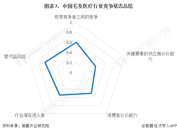 根据以上分析,对各方面的竞争情况进行量化,1代表最大,0代表最小,目前我国毛发医疗行业五力竞争总结如下: