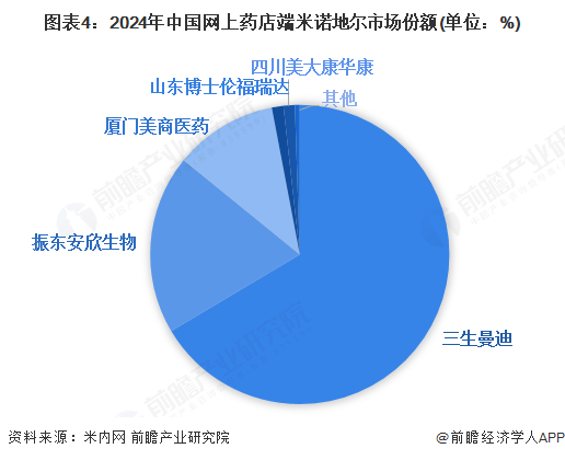 2024年,中国网上药店端米诺地尔市场集中度非常高,行业前三大品牌市场份额合计达到97%,前5大品牌市场份额达到99%。