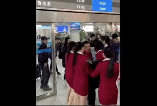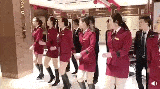 女员工清一色黑色紧身短裙,浅色,脚踏恨天高高跟鞋。感觉是以让女兵都穿上超短裙为人生目标的海军军官下岗再就业的项目。
